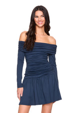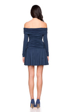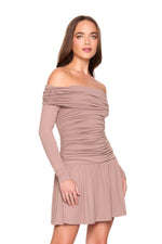 off shoulder gathered mini dress