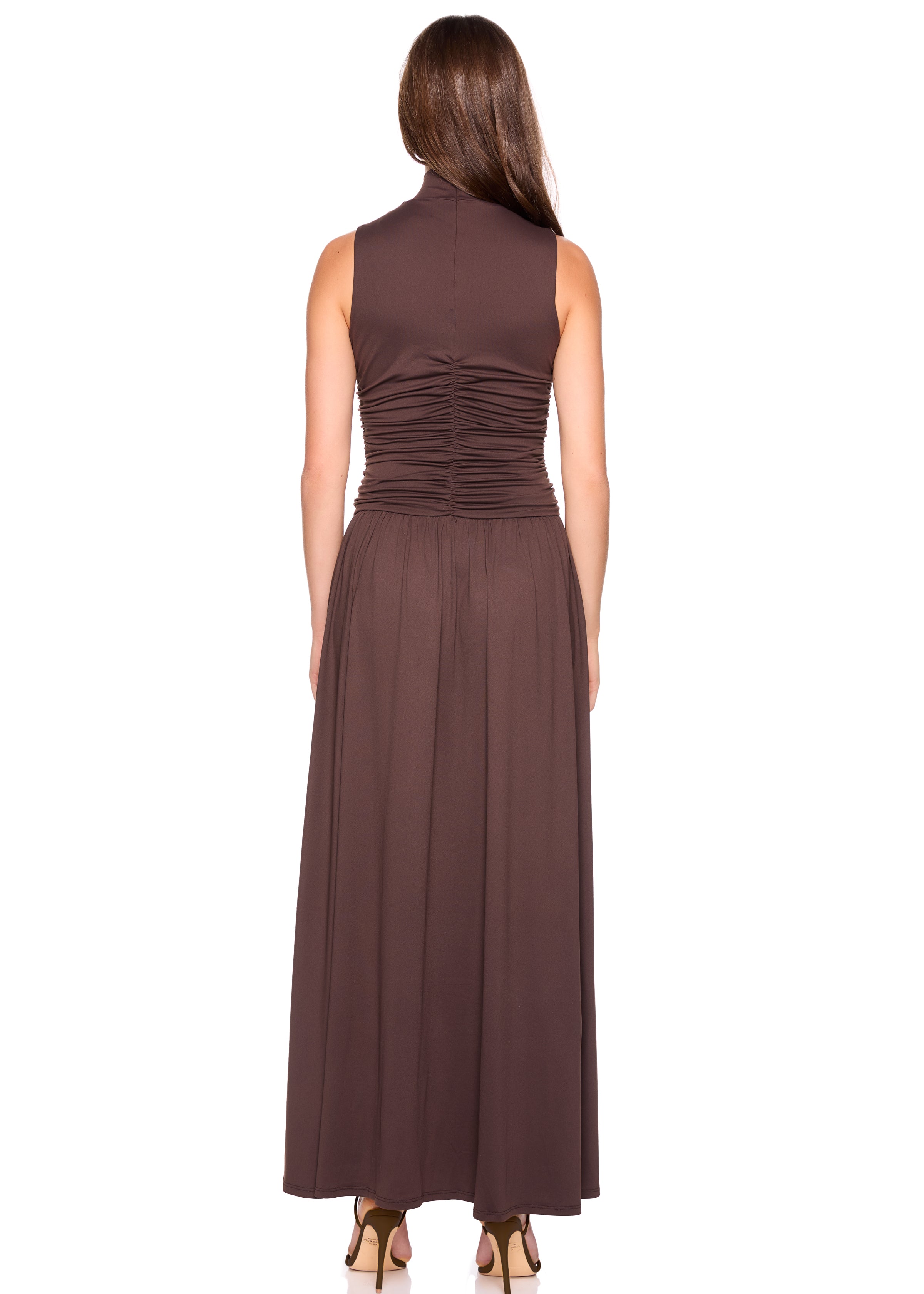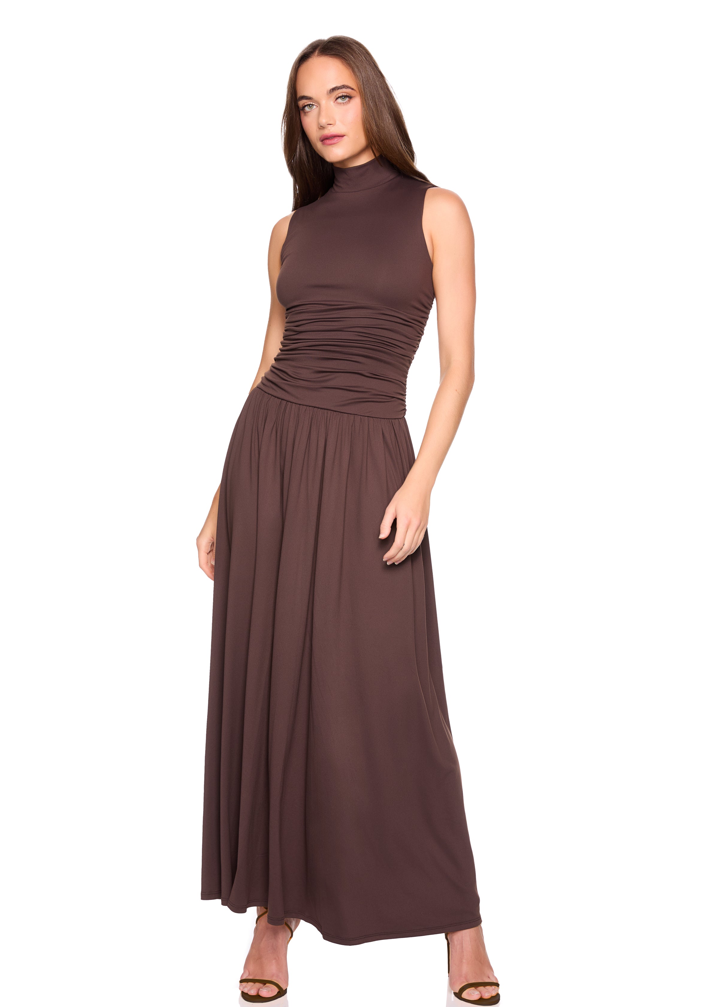 mock neck drop waist gathered dress