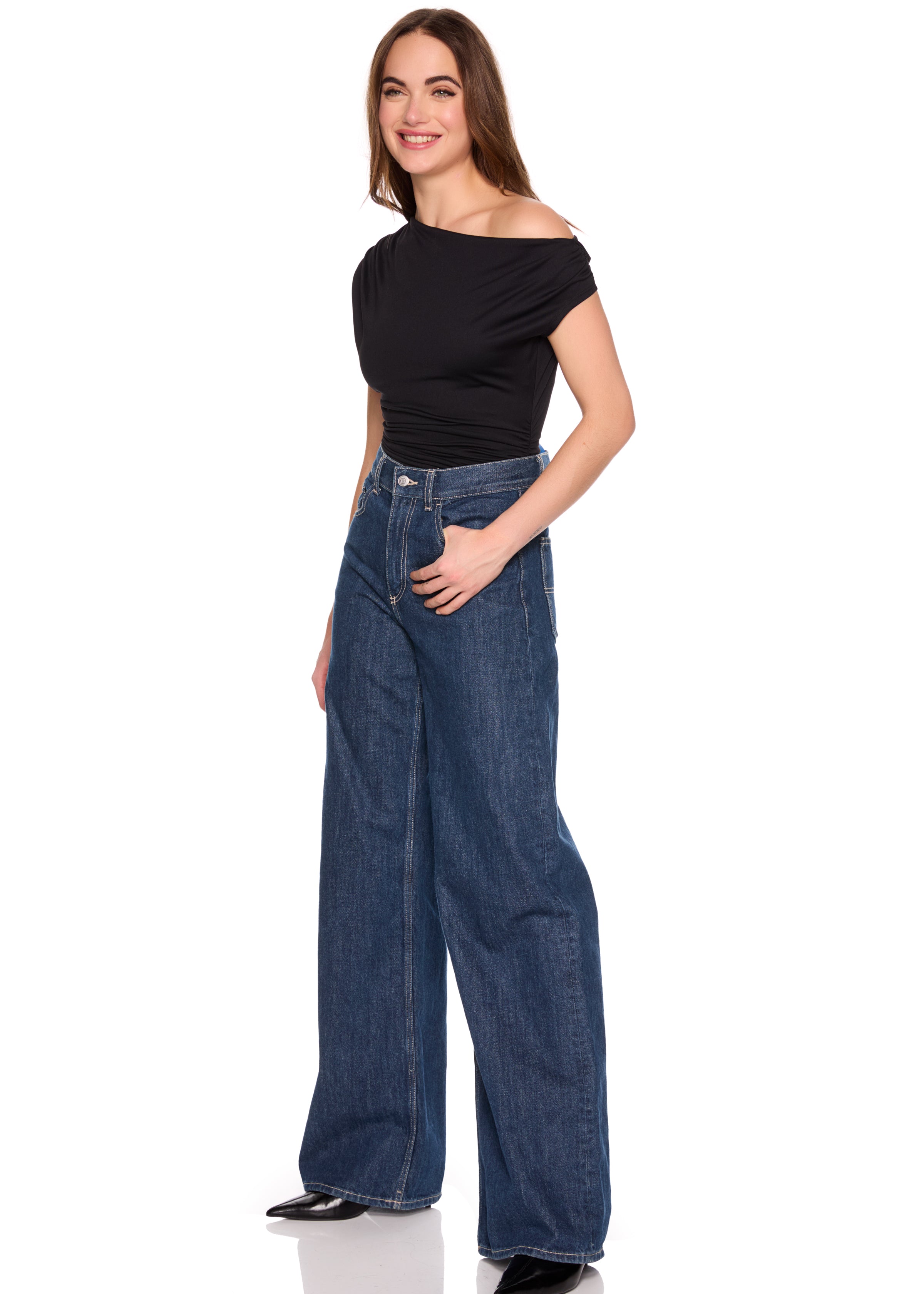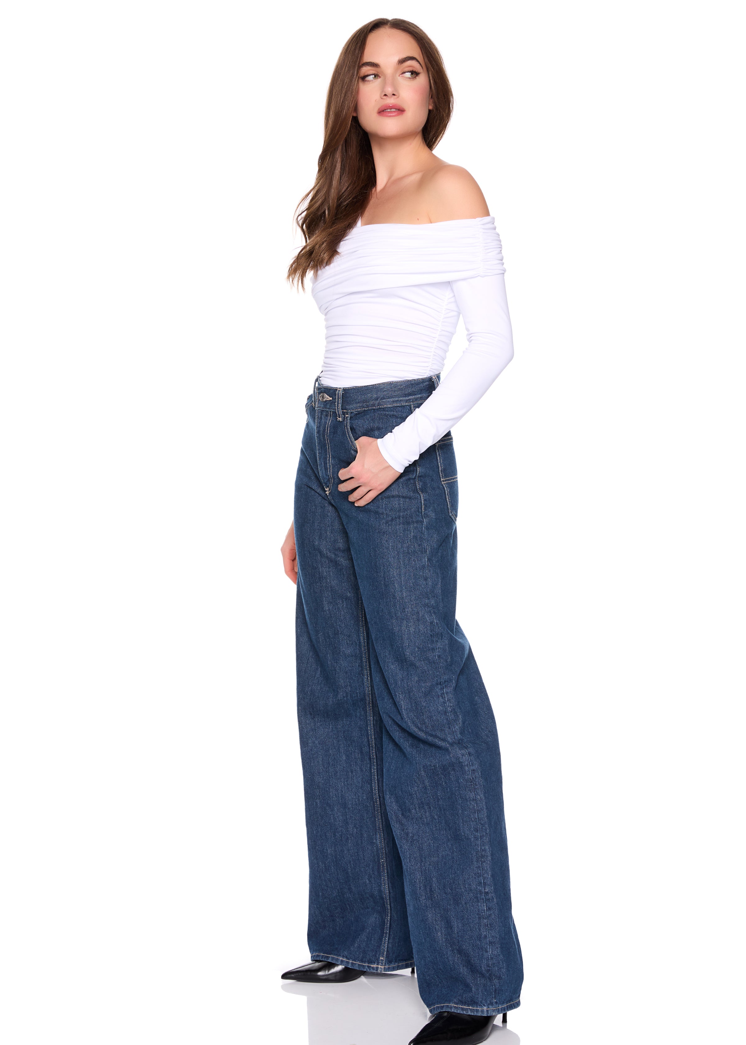 one arm slight off shoulder