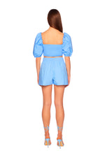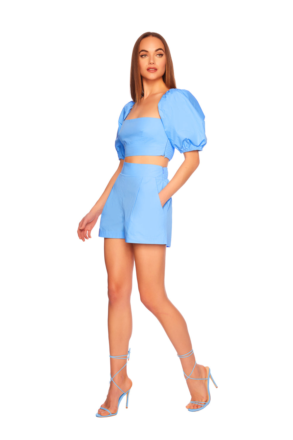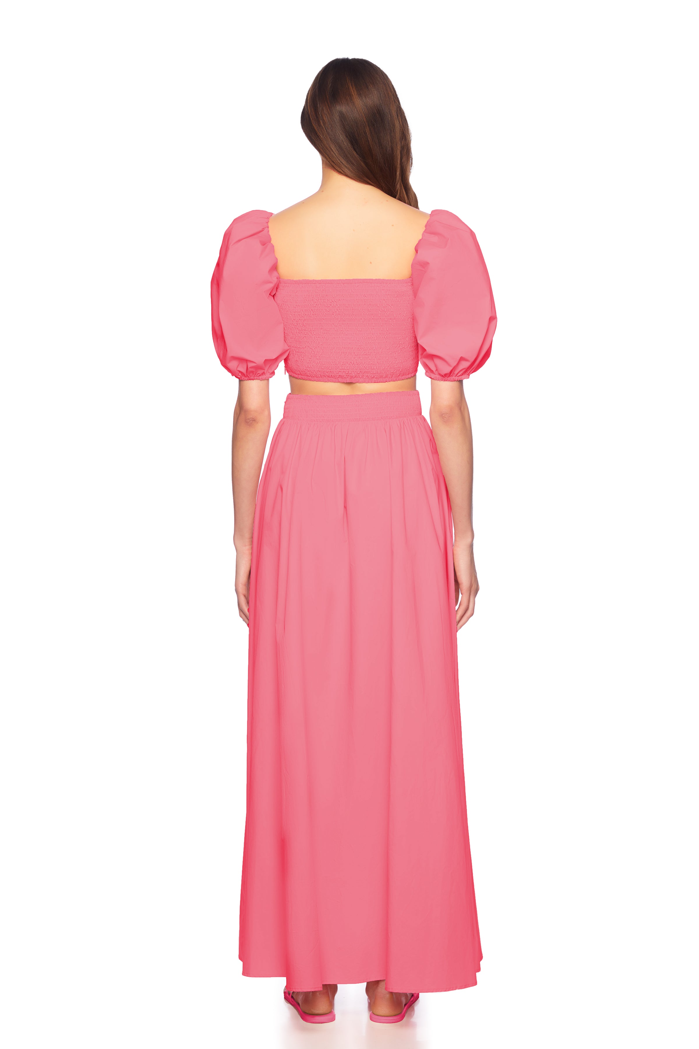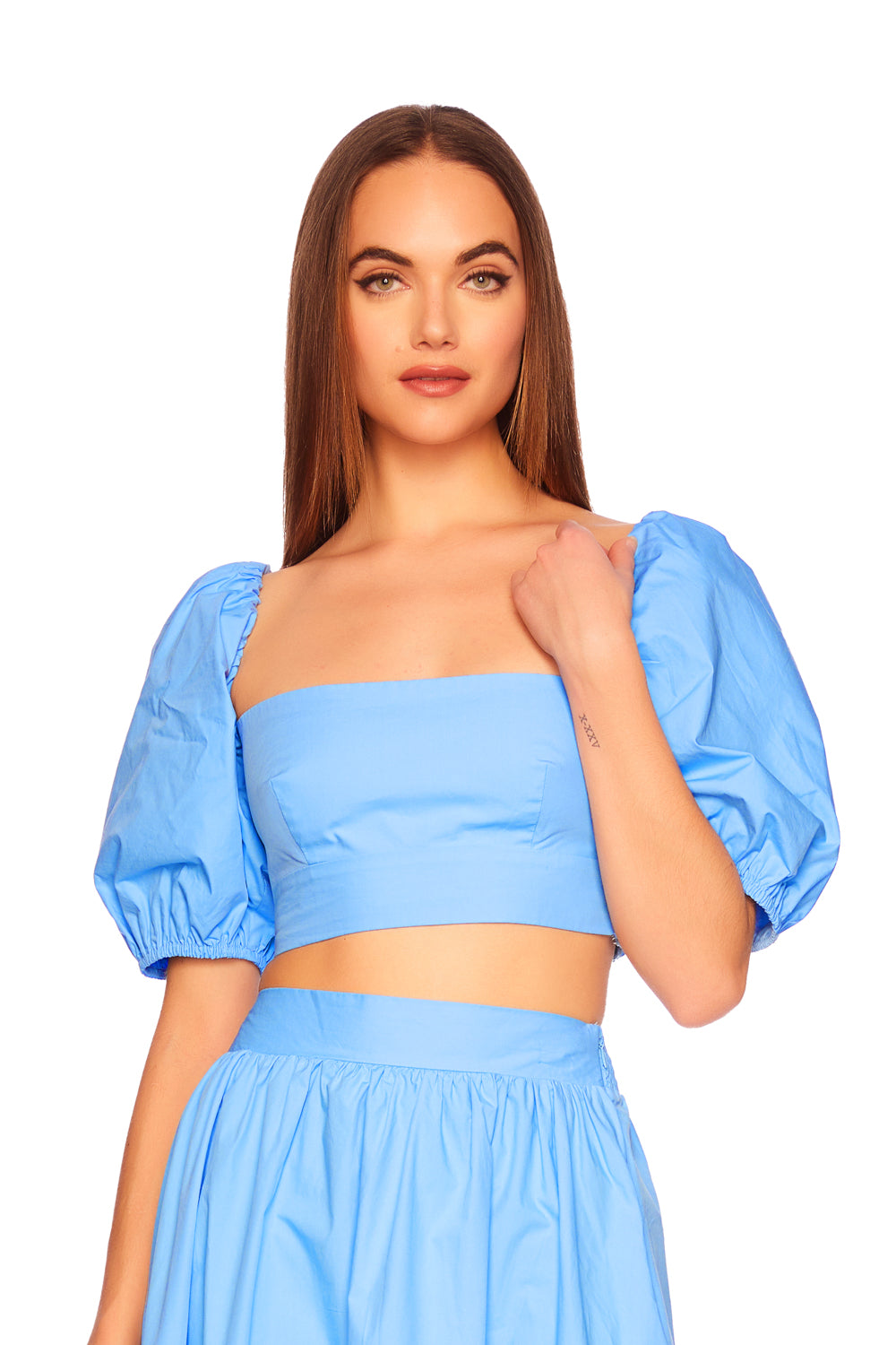 turn on the charm in this crisp poplin crop top designed with puff sleeves that dip off the shoulders. pair our iconic puff sleeve top with our crop waist cotton poplin maxi skirt to turn heads at your next summer party.